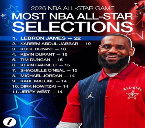 统计显示,詹姆斯今年入选后,以22次入选次数再度扩大领先优势。